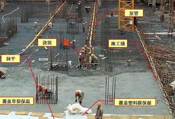 6、大體積泵送混凝土經(jīng)振搗后表面水泥漿較厚,容易引起表面裂縫。首先,要求在振搗最上一層混凝土?xí)r,控制振搗時間,注意避免表層產(chǎn)生太厚的浮漿層;在澆搗后,必須及時用2m 長括尺,將多余浮漿層刮除,按照標高控制點,將混凝土表面括拍平整。有凹坑的部位必須用混凝土填平,在混凝土收漿接近初凝時,混凝土面進行二次抹光,用木蟹全面仔細打抹兩遍,既要確?;炷恋钠秸?,又要把其初期表面的收縮脫水細縫閉合,在混凝土收漿凝固施工期間,除了具體施工人員外,不得在未干硬的混凝土面上隨意行走,收漿工作完成的面必須同步及時覆蓋薄膜。
