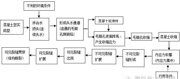 作者在攪拌站成立之初的抗裂實(shí)踐中,對(duì)這些現(xiàn)象也深感困惑。直到后來明確了早期裂縫是因?yàn)榛炷潦^多所致,并對(duì)這一機(jī)理進(jìn)行了深入研究,才重新認(rèn)識(shí)了混凝土收縮裂縫形成的全過程,如圖1[5]所示。