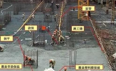 6、大體積泵送混凝土經(jīng)振搗后表面水泥漿較厚,容易引起表面裂縫。首先,要求在振搗最上一層混凝土?xí)r,控制振搗時(shí)間,注意避免表層產(chǎn)生太厚的浮漿層;在澆搗后,必須及時(shí)用2m 長括尺,將多余浮漿層刮除,按照標(biāo)高控制點(diǎn),將混凝土表面括拍平整。有凹坑的部位必須用混凝土填平,在混凝土收漿接近初凝時(shí),混凝土面進(jìn)行二次抹光,用木蟹全面仔細(xì)打抹兩遍,既要確保混凝土的平整度,又要把其初期表面的收縮脫水細(xì)縫閉合,在混凝土收漿凝固施工期間,除了具體施工人員外,不得在未干硬的混凝土面上隨意行走,收漿工作完成的面必須同步及時(shí)覆蓋薄膜。