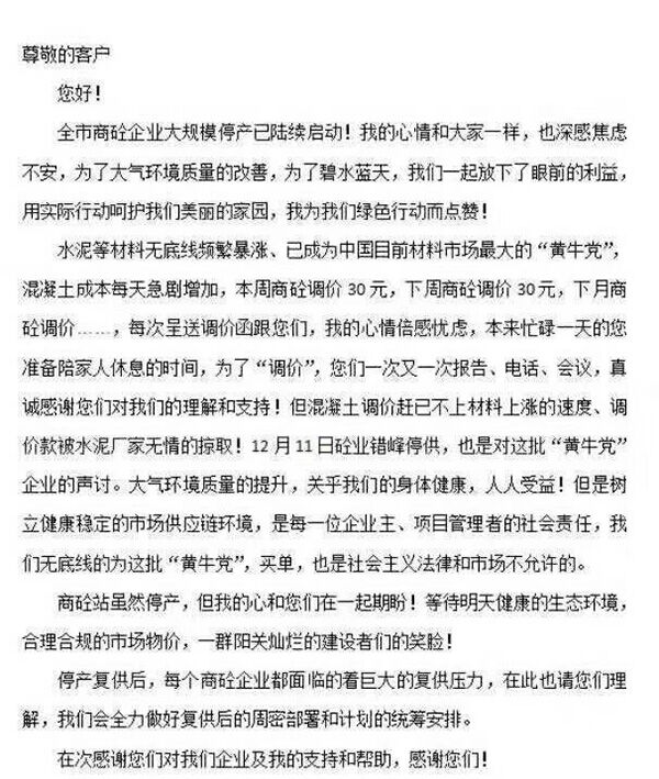 決議除了請(qǐng)求政府干預(yù)價(jià)格之外,還要求會(huì)員單位堅(jiān)決抵制因價(jià)格波動(dòng)采取惡意低價(jià)競(jìng)爭(zhēng)搶占市場(chǎng)的行為;要求會(huì)員單位與施工單位及時(shí)溝通,在雙方因價(jià)格調(diào)整未達(dá)成一致且合同未終止前,其他企業(yè)一律不得低價(jià)介入;要求各片區(qū)響應(yīng)政府環(huán)保要求,及時(shí)采取錯(cuò)峰生產(chǎn)、停產(chǎn)限產(chǎn)等措施。