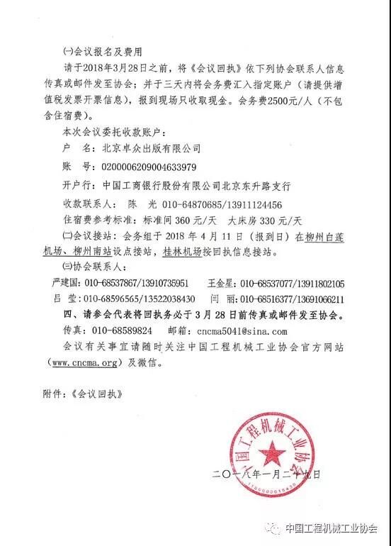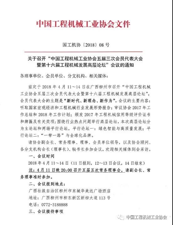 中國(guó)工程機(jī)械工業(yè)協(xié)會(huì)茲定于2018年4月11~14日在廣西柳州市召開(kāi)“中國(guó)工程機(jī)械工業(yè)協(xié)會(huì)五屆三次會(huì)員代表大會(huì)暨第十六屆工程機(jī)械發(fā)展高層論壇”。會(huì)員代表大會(huì)的主題是“新時(shí)代、新理念、新作為”。