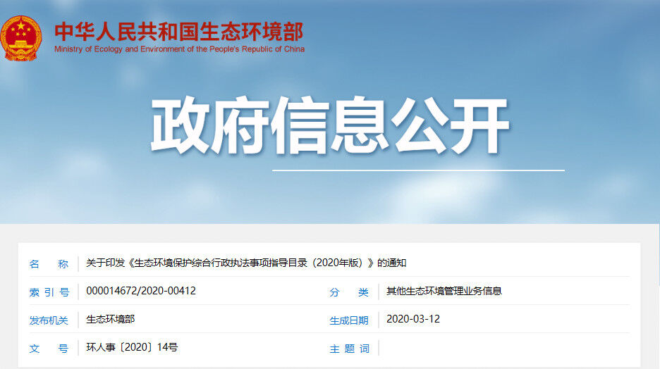 近日,生態(tài)環(huán)境部發(fā)布了關(guān)于印發(fā)《生態(tài)環(huán)境保護(hù)綜合行政執(zhí)法事項(xiàng)指導(dǎo)目錄(2020年版)》(以下簡稱“《指導(dǎo)目錄》”)的通知,稱根據(jù)深化黨和國家機(jī)構(gòu)改革有關(guān)安排部署,為貫徹落實(shí)《國務(wù)院辦公廳關(guān)于生態(tài)環(huán)境保護(hù)綜合行政執(zhí)法有關(guān)事項(xiàng)的通知》(國辦函〔2020〕18號(hào))要求,扎實(shí)推進(jìn)生態(tài)環(huán)境保護(hù)綜合行政執(zhí)法改革,現(xiàn)印發(fā)《生態(tài)環(huán)境保護(hù)綜合行政執(zhí)法事項(xiàng)指導(dǎo)目錄(2020年版)》及說明。