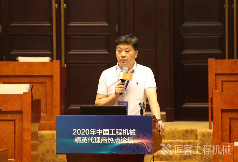 中國工程機(jī)械工業(yè)協(xié)會代理商工作委員會秘書長、匠客工程機(jī)械傳媒總經(jīng)理?xiàng)钪痉贾鞒稚衔绲臅h并發(fā)言