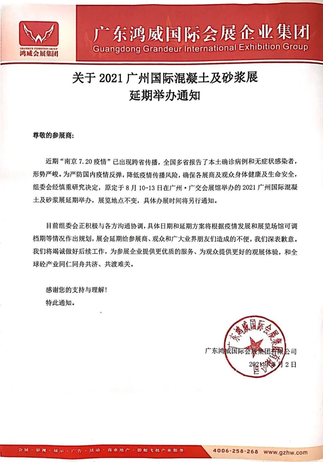 由于當(dāng)前國內(nèi)多地出現(xiàn)新型冠狀病毒肺炎新增確診病例、中高風(fēng)險(xiǎn)地區(qū)不斷增加的疫情嚴(yán)峻形勢影響,為全力配合做好疫情防控工作,避免大規(guī)模聚集和降低疫情傳播風(fēng)險(xiǎn),保障參展商、觀眾及工作人員健康安全,維護(hù)參展單位權(quán)益,確保展會(huì)效果,組委會(huì)經(jīng)慎重研究決定,原定于8月10-13日在廣州·廣交會(huì)展館舉辦的2021廣州國際混凝土及砂漿展延期舉辦,展覽地點(diǎn)不變,具體辦展時(shí)間將另行通知。