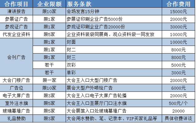 八、合作方式:我們誠摯邀請并期待您的參與,合作方式包括但不僅限于:企業(yè)演講、參展證廣告、參觀證廣告、會刊廣告、戶外廣告位、注水旗、電子大屏、玻璃幕墻廣告、大會門樓廣告、禮品贊助、晚宴贊助等
