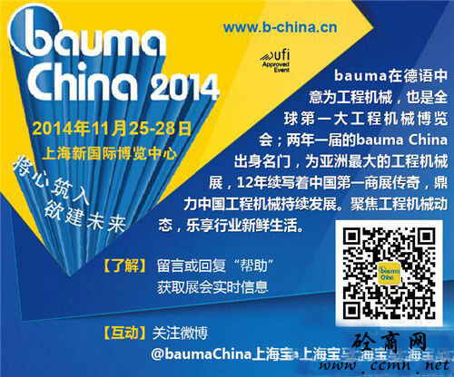 China 2014,11月25-28日行業(yè)翹楚絢麗登陸上海新國際博覽中心,工程機械行業(yè)產(chǎn)品全面細分展示。看風云變幻,捕行業(yè)動向,我們相約bauma China 2014!