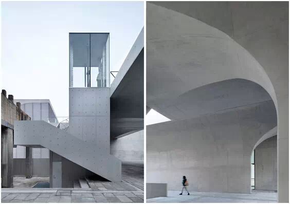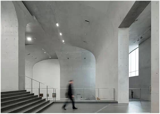 在“傘拱”結(jié)構(gòu)的空腔里,地面以上的“傘拱”覆蓋空間,墻體和天花均為清水混凝土的表面,它們的幾何分界位置也變得模糊。這樣的結(jié)構(gòu)性空間,在形態(tài)上不僅對人的身體形成庇護(hù)感,亦與保留的江邊碼頭的煤料斗產(chǎn)生視覺呼應(yīng)。建筑的內(nèi)部空間也得以呈現(xiàn)一種原始的野性魅力,而有著大小調(diào)節(jié)的空間尺度以及留有模板拼縫和螺栓孔的清水混凝土表面又會帶來一種現(xiàn)實感。這種“直白”式的結(jié)構(gòu)、材料、空間所形成的直接性與樸素性,加上大尺度出挑所產(chǎn)生的力量感或輕盈感,使整個建筑與原有場地的工業(yè)特質(zhì)間取得一種時間與空間的接續(xù)關(guān)系。地面以上的清水混凝土“傘拱”下的流動展覽空間和地下一層傳統(tǒng)“白盒子”式的展覽空間由一個呈螺旋回轉(zhuǎn)、層層跌落的階梯空間聯(lián)接,既原始又現(xiàn)實的空間和古代、近代、現(xiàn)代直到當(dāng)代藝術(shù)的展覽陳列,這種并置的張力,呈現(xiàn)出一種具有時間性的展覽空間。