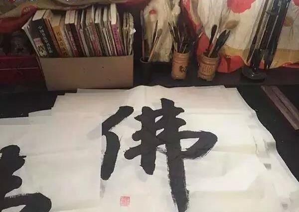 他家里有一個小書房,墻上掛滿了書法字畫,書架塞滿了書。家人說他不用去工地的時候,就悶在書房里寫毛筆字。桌上摞著一疊裁好的方形宣紙,每張都寫有一個大大的“佛”字,左下角蓋著印章。