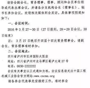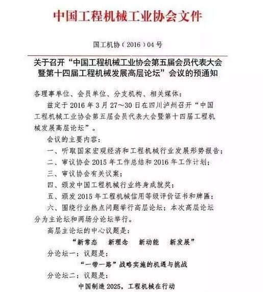 中國(guó)工程機(jī)械工業(yè)協(xié)會(huì)第五屆會(huì)員代表大會(huì)暨第十四屆工程機(jī)械發(fā)展高層論壇茲定于2016年3月27日~30日在四川瀘州召開(kāi)。