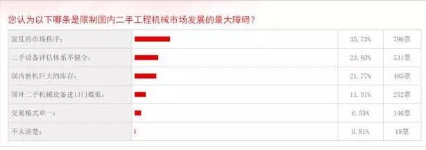 工程機(jī)械區(qū)別于其他行業(yè)一個(gè)重要的地方是,二手商品的回收利用尤為重要,因?yàn)橐粋€(gè)機(jī)械的生命周期相對(duì)于快消品來說更長,所以在二手商品的回收、租賃同樣存在巨大機(jī)會(huì)。但是該行業(yè)目前發(fā)展前景不明朗。在慧聰工程機(jī)械網(wǎng)的一項(xiàng)“限制二手工程機(jī)械市場(chǎng)發(fā)展的最大障礙”的投票中,“混亂的市場(chǎng)秩序”得票最高,796票,“二手設(shè)備評(píng)估體系不健全”排名第二,得票531,“國內(nèi)新機(jī)的巨大庫存”排名第三,得票485。