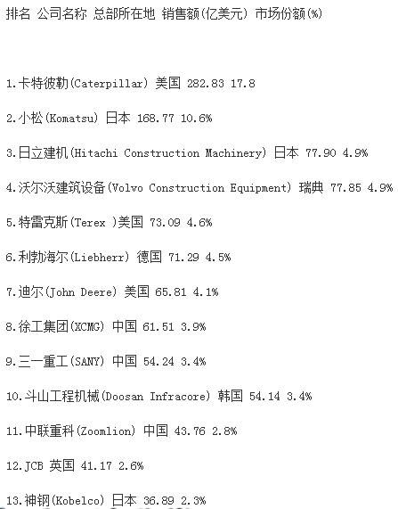 近日,國(guó)際權(quán)威行業(yè)雜志《國(guó)際建設(shè)》International Construction發(fā)布了最新全球工程機(jī)械制造商50強(qiáng)排行榜(Yellow Table 2016)。通過(guò)榜單我們可以看到,徐工集團(tuán)(XCMG)成為唯一一家進(jìn)入前十位的中國(guó)企業(yè)。