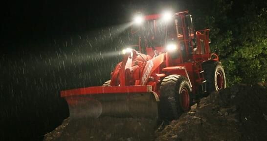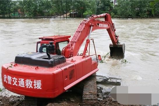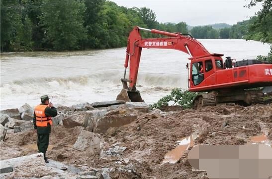 裝載機和挖掘機不停挖土并傾倒在河床上,山頂滑下來的巨石被填筑在路基邊坡,加固道路,保障安全,推土機在后方盡量推平直到可以供車輛行人行走,這是一幅抗洪救災現(xiàn)場最常見的畫面,通力合作的除了武警官兵和救援人員們,就屬這些工程機械設備最為搶眼了。