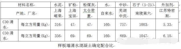 最終,第四段樣板墻實踐完成后,根據業(yè)主、監(jiān)理、設計等各方的意見最終明確正式清水混凝土施工的配合比: