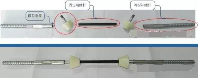 根據對日本已完清水混凝土工程考察結果,日方在施工中均采用三接頭的對拉螺桿,施工中有效解決了螺桿眼部位的失水漏漿的問題,有效避免了熊貓眼的發(fā)生。為了有效保護清水模板的表面,通過多輪試驗對比,特別研制出了五段式對拉螺桿。