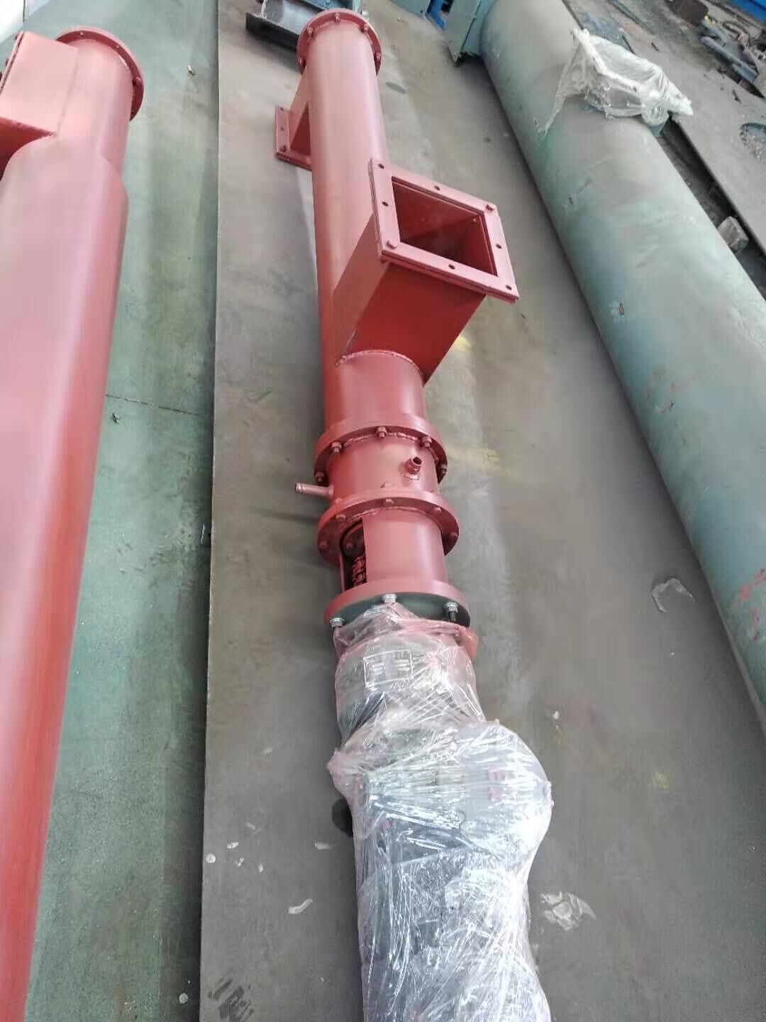 螺旋輸送機(jī)螺旋面的形式有實(shí)體螺旋(S制法)和帶式螺旋(D制法)兩種。各螺旋軸之間采用法蘭式聯(lián)接, 保證了聯(lián)接軸的互換性,便于維修。 螺旋輸送機(jī)機(jī)蓋為瓦片式并用蓋扣夾緊在機(jī)殼上,若需改進(jìn)密封性能,用戶可自行在機(jī)蓋與機(jī)殼間加防水粗帆布。 螺旋輸送機(jī)進(jìn),出料裝置有進(jìn)料口,方型出料口,手推式出料口,齒條式出料口四種,由用戶在使用現(xiàn)場(chǎng)在機(jī)體上開(kāi)口焊接。布置螺旋輸送機(jī)進(jìn),出料口位置時(shí)應(yīng)注意保證料口至端部的距離,同時(shí)避免料口與吊軸承加油杯,機(jī)殼聯(lián)接法蘭,底座等相碰。