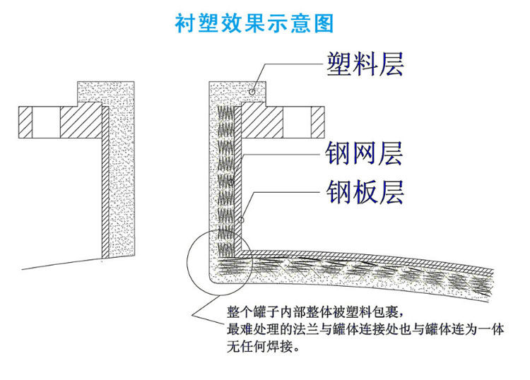 鋼襯塑儲(chǔ)罐是以聚乙烯(PE)為原料,采用旋塑工藝(滾塑技術(shù))一次整體成型。將鋼網(wǎng)焊接于鋼體表面,使鋼體表面、鋼、網(wǎng)、塑復(fù)合形成一個(gè)整體,這種鋼襯塑儲(chǔ)罐既有高強(qiáng)度物理機(jī)械性能又有高強(qiáng)度耐化學(xué)腐蝕性能。