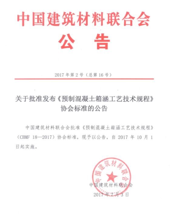 2017年7月,由中國混凝土與水泥制品協(xié)會(以下簡稱協(xié)會)組織制定的《預制混凝土箱涵工藝技術(shù)規(guī)程》和《混凝土用氧化鎂膨脹劑》兩項協(xié)會標準,通過審定并發(fā)布批準公告,標準號分別為CBMF 18-2017和CBMF 19-2017,將同時于2017年10月1日起實施。這是國務院《深化標準化工作改革方案》(國發(fā)[2015]13號)及質(zhì)檢總局、國家標準委《關(guān)于培育和發(fā)展團體標準的指導意見》(國質(zhì)檢標聯(lián)[2016]109號)發(fā)布后,協(xié)會與中國建筑材料聯(lián)合會(以下簡稱聯(lián)合會)聯(lián)合發(fā)布的首批協(xié)會標準,兩項標準將公開出版并發(fā)行。