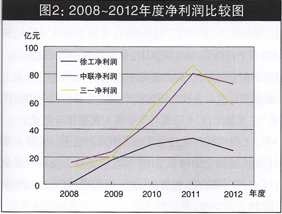 分析工程機(jī)械上市公司三駕馬車5年主要會(huì)計(jì)數(shù)據(jù)表明(見(jiàn)表1):中聯(lián)連續(xù)5年實(shí)現(xiàn)營(yíng)業(yè)收入增長(zhǎng),徐工、三—在實(shí)現(xiàn)4年?duì)I業(yè)收入連續(xù)增長(zhǎng)后,2012年?duì)I業(yè)收入出現(xiàn)負(fù)增長(zhǎng)。從表1可知,三家上市公司凈利潤(rùn)指標(biāo),均在實(shí)現(xiàn)連續(xù)4年上漲后,于2012年同時(shí)出現(xiàn)負(fù)增長(zhǎng)。從圖1、圖2可見(jiàn)三駕馬車2008年、2012年?duì)I業(yè)收入、凈利潤(rùn)排名一致,分別是中聯(lián)、三一、徐工,而在五年中的2009、2010、2011三年,以上排名互有消長(zhǎng)。比較主營(yíng)業(yè)務(wù)十分接近的兩家上市公司三一和中聯(lián),我們發(fā)現(xiàn):在五年之中,當(dāng)GDP增長(zhǎng)率走高時(shí),三一的主營(yíng)業(yè)務(wù)收入增長(zhǎng)率、凈利潤(rùn)增長(zhǎng)率高于中聯(lián),在經(jīng)濟(jì)下行壓力增大,GDP增長(zhǎng)率走低時(shí),中聯(lián)的收入增長(zhǎng),具有相對(duì)穩(wěn)定性(見(jiàn)圖1)。