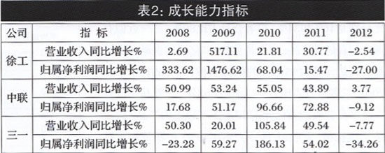 公司的成長(zhǎng)與盈利能力正相關(guān)。在年報(bào)中,主營(yíng)業(yè)務(wù)收入增長(zhǎng)率、凈利潤(rùn)增長(zhǎng)率、凈資產(chǎn)增長(zhǎng)率以及凈資產(chǎn)收益率、毛利率、凈利率等財(cái)務(wù)指標(biāo),是判斷企業(yè)成長(zhǎng)性和盈利能力的重要指標(biāo)。表2顯示,三駕馬車中,5年主營(yíng)業(yè)務(wù)收入同比增長(zhǎng)率實(shí)現(xiàn)連續(xù)5年正增長(zhǎng)、連續(xù)三年保持30%以上增長(zhǎng)率的公司是中聯(lián),五年中增長(zhǎng)率振幅最大的公司是徐工,2012年徐工和三—主營(yíng)業(yè)務(wù)收入增長(zhǎng)率均出現(xiàn)負(fù)增長(zhǎng);表2還顯示,凈利潤(rùn)同比增長(zhǎng)率方面,沒(méi)有—家公司連續(xù)五年正增長(zhǎng),2012年三駕馬車同時(shí)出現(xiàn)負(fù)增長(zhǎng),三一錄得-34.26%的最大降幅。在大環(huán)境不利因素作用下,公司成長(zhǎng)性受到嚴(yán)峻挑戰(zhàn)(見(jiàn)圖2)。