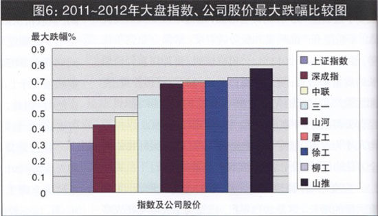 2011年,行業(yè)遭遇寒冬,三駕馬車營(yíng)業(yè)收入合計(jì)增三率與宏觀經(jīng)濟(jì)指標(biāo)對(duì)比,呈加速度下跌態(tài)勢(shì),而且在資本市場(chǎng)的表現(xiàn)弱于滬深大盤指數(shù)。2011年~2012年間,其股價(jià)從最高點(diǎn)至最低點(diǎn),下跌47.3%、61.2%、69.8%不等;而同期上證指數(shù)下跌幅度只有30.67%,深成指下跌42.1%。盡管與行業(yè)內(nèi)其他上市公司同期資本市場(chǎng)表現(xiàn)相比,工程機(jī)械行業(yè)三駕馬車的表現(xiàn)仍有亮點(diǎn),但其同期跌幅大于上證和深成指跌幅,仍然令公司形象受損,影響資本市場(chǎng)再融資能力。因此,打造公司核心競(jìng)爭(zhēng)力,提升公司投資價(jià)值,提振資本市場(chǎng)投資者信心,至關(guān)重要(大盤指數(shù)、公司股價(jià)最大跌幅比較圖,見(jiàn)圖6)。