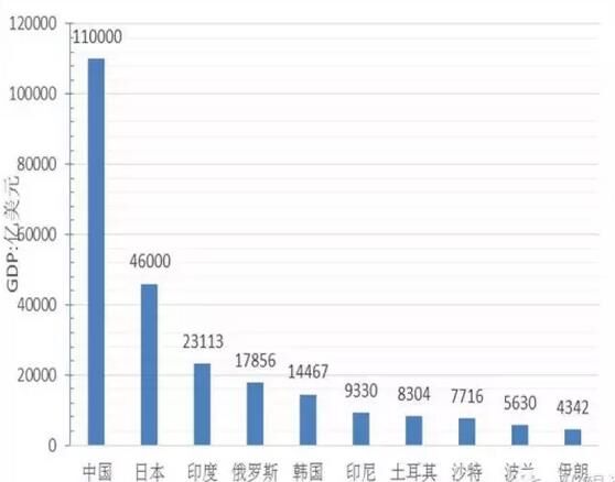 從經(jīng)濟(jì)總量看,GDP超過1萬億美元的國(guó)家5個(gè),分別為中國(guó)、日本、印度、俄羅斯、韓國(guó),其中中國(guó)經(jīng)濟(jì)總量為11萬億美元、位居第一、為最小國(guó)家不丹的5800倍,約占“一帶一路”地區(qū)經(jīng)濟(jì)總量的40%;GDP在5000億到1萬美元的國(guó)家4個(gè),分別是印尼、土耳其、沙特、波蘭;GDP在1000億到5000億美元的國(guó)家19個(gè),GDP在100億到1000億美元的國(guó)家30個(gè);低于100億元美元的國(guó)家8個(gè),分別為塔吉克斯坦、蒙古、吉爾吉斯坦、摩爾多瓦、巴勒斯坦、黑山、馬爾代夫、不丹,其中經(jīng)濟(jì)規(guī)模最小為不丹、GDP為19億美元。